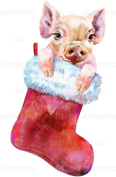 Рождественский красный носок для подарков с маленькой свинкой на белом фоне. Акварель рисованной иллюстрации