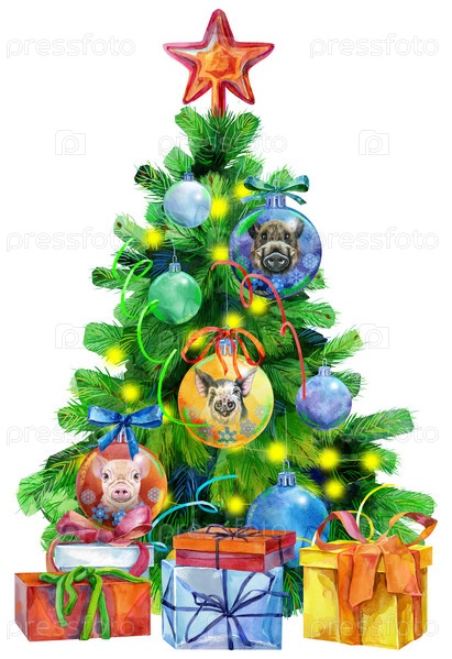 Акварельная иллюстрация: Рождественская елка украшена шарами с изображением свиньи. Шаблон для оформления плакатов, открыток, приглашений