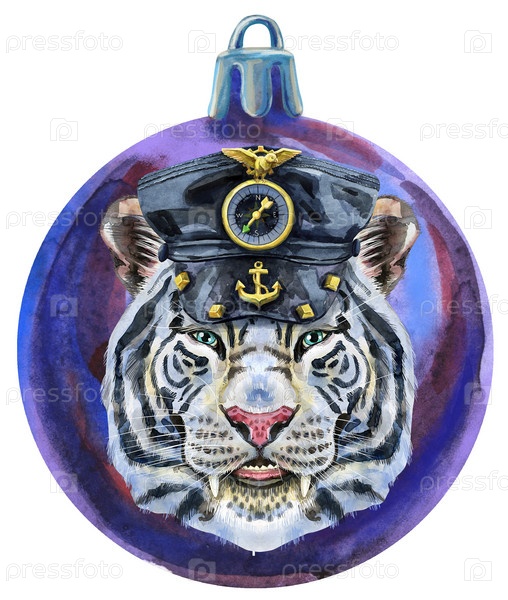 Акварель Рождественский фиолетовый шар с тигром на белом фоне