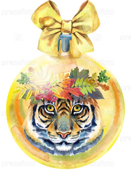 Акварель желтый Рождественский бал с луком и тигром, изолированные на белом фоне
