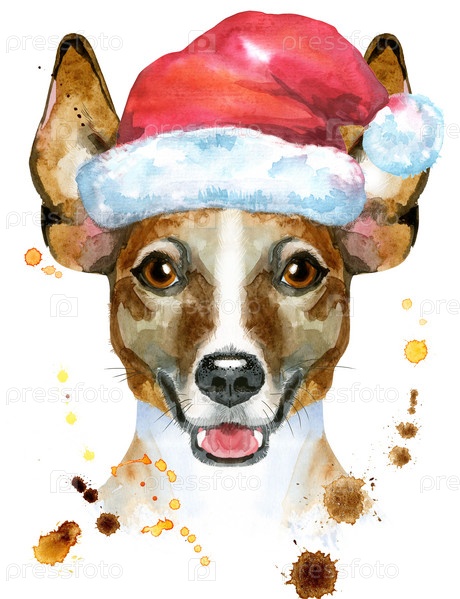 Милая собака. Графика на футболках с собаками. акварель джек рассел терьер иллюстрация в шляпе Санты
