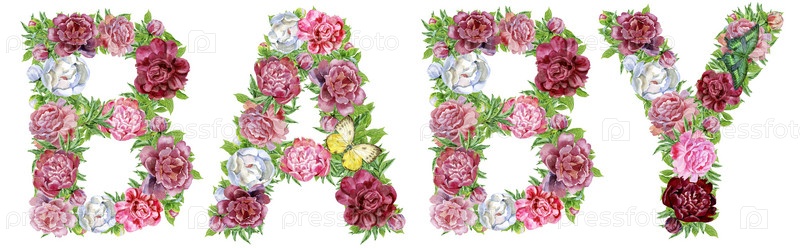 Слово BABY из акварельных пион, цветов и бабочек
