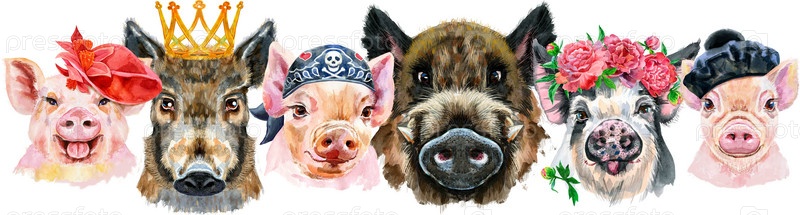 Бордюр из свиней. Акварельные портреты свиней и кабанов