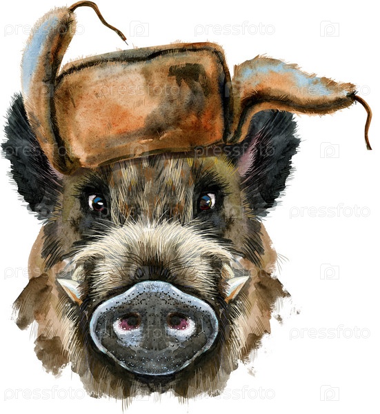 Акварельный портрет кабана в шляпе с ушками