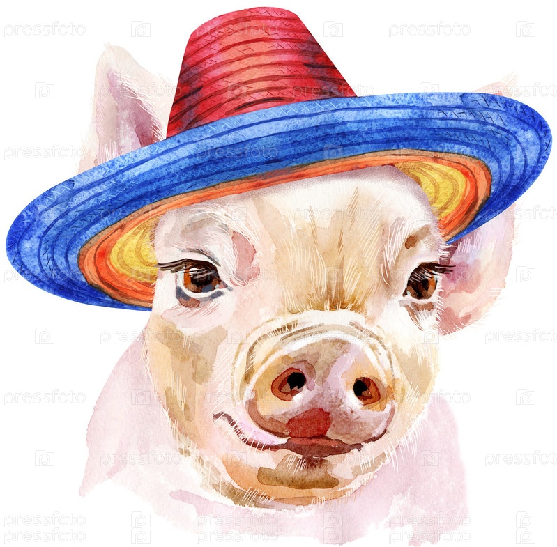 Акварельный портрет мини-свиньи в шляпе сомбреро