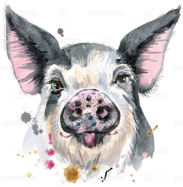 Милый поросенок. Свинья для графики на футболках. Акварельная свинья в черных пятнах