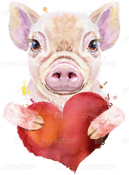 Милый поросенок. Свинья для графики на футболках. Акварельная розовая мини-свинья с иллюстрацией красного сердца