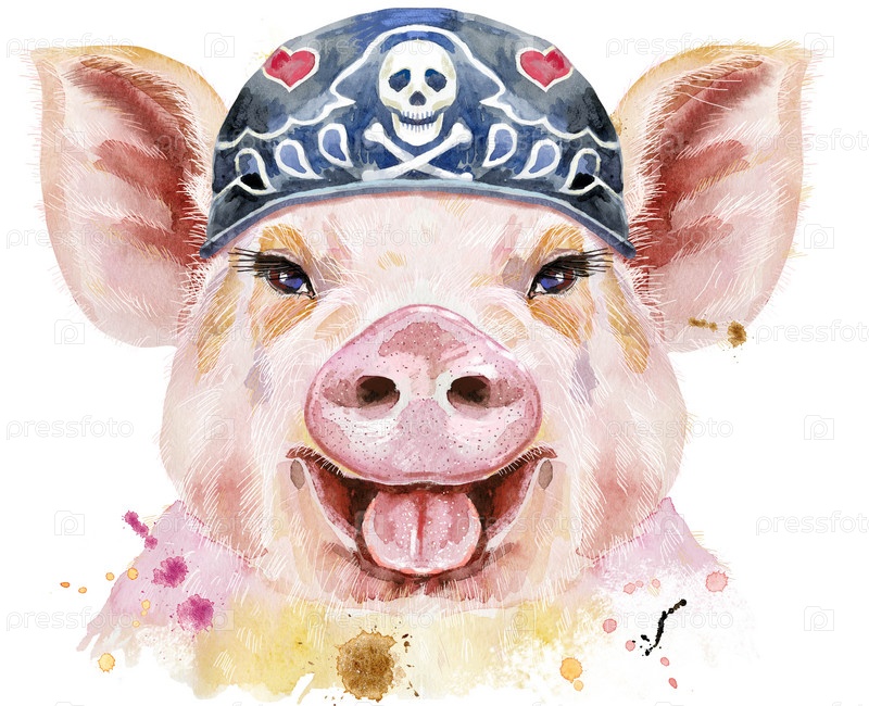Милый поросенок. Свинья для графики на футболках. Акварельная розовая свинья в байкерской бандане