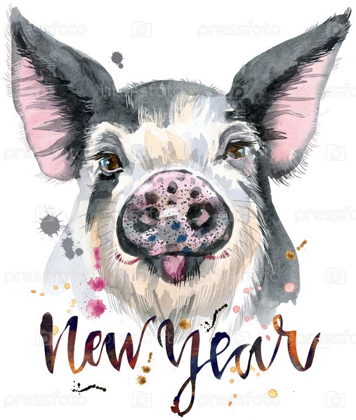 Акварельный портрет свиньи с надписью "Новый год"