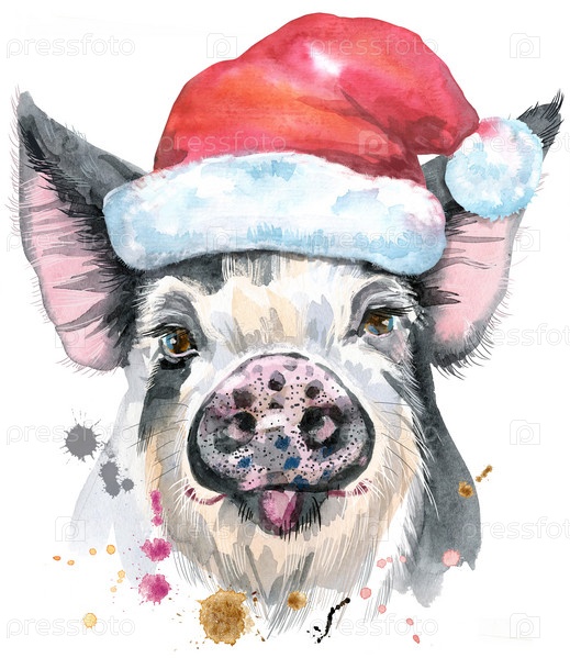 Акварельный портрет свиньи в шляпе Санты