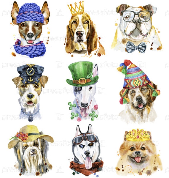 Симпатичный набор акварельных портретов собак. Для графики на футболках. Акварельные иллюстрации собак