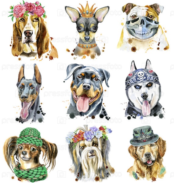 Симпатичный набор акварельных портретов собак. Для графики на футболках. Акварельные иллюстрации собак