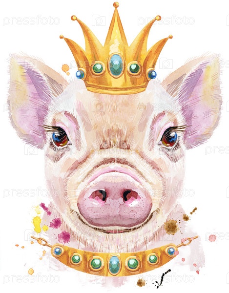 Милый поросенок. Свинья для графики на футболках. Акварельная розовая мини-свинья с короной