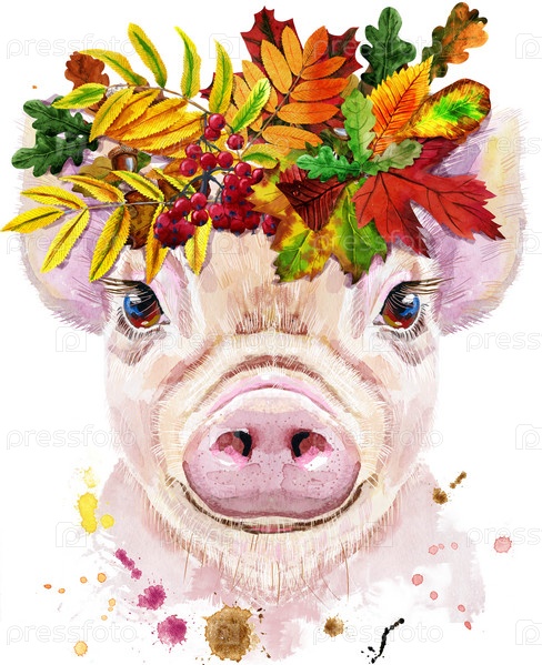 Красивая свинья в венке из листьев. Цветы. Акварельная иллюстрация с вкраплениями