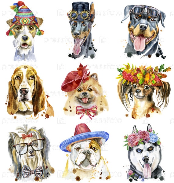 Набор акварельных портретов собак для украшения