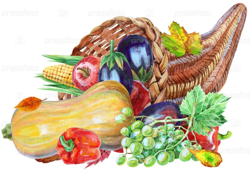 Акварельный рог изобилия с овощами и фруктами на белом фоне