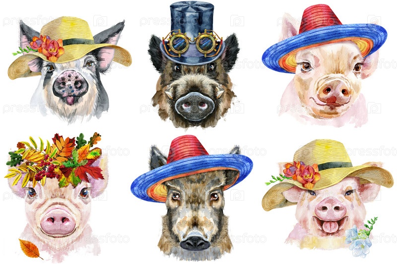 Набор портретов свиней. Акварельные иллюстрации животных на белом фоне
