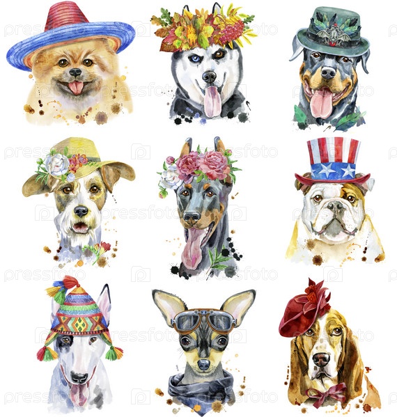Набор акварельных портретов собак для украшения