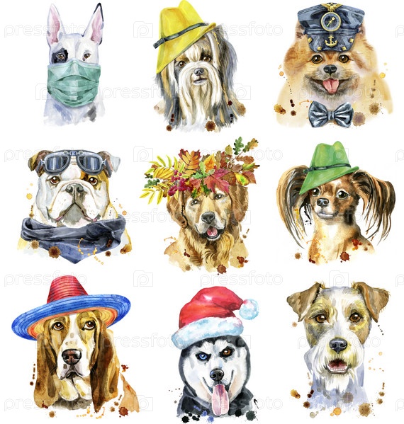 Набор акварельных портретов собак для украшения