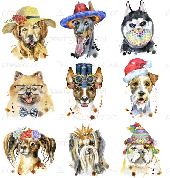 Набор акварельных портретов собак для украшения