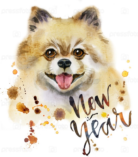 Милая собака. Графика на футболках с собаками. акварель померанский шпиц иллюстрация с надписью Новый год