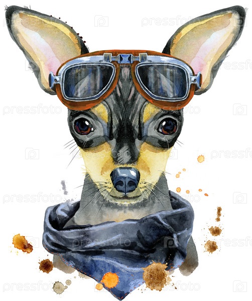 Акварельный портрет игрушечного терьера в байкерских солнцезащитных очках