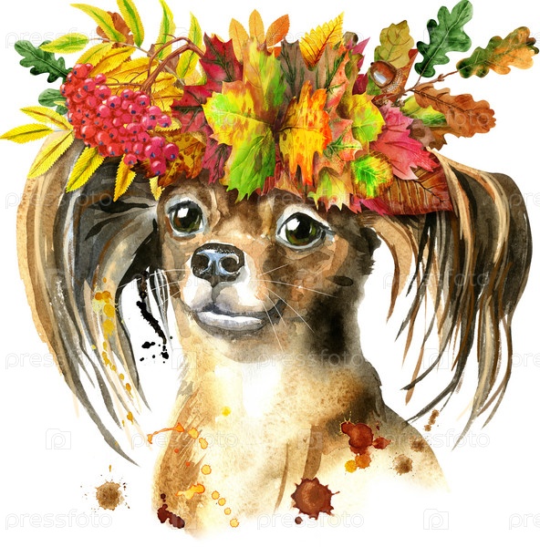 Симпатичная собака в венке из осенних листьев. Графика на футболках с собаками. акварель тойл терьер иллюстрация
