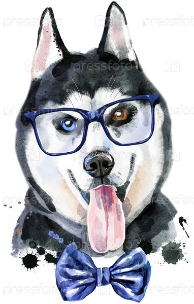 Симпатичная собака с бабочкой и очками. Графика на футболках с собаками. акварель хаски