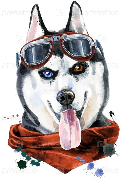 Симпатичная собака с платком и очками. Графика на футболках с собаками. акварель хаски
