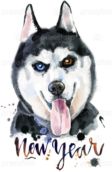Милая собака. Графика на футболках с собаками. акварельный хаски с надписью Новый год
