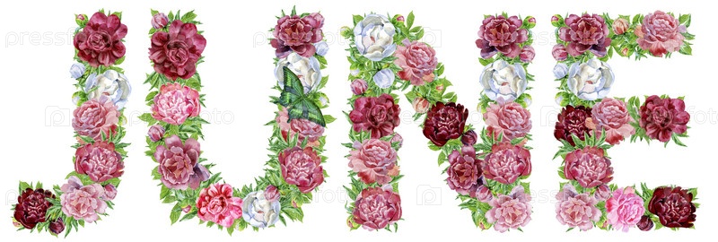 Слово ИЮНЬ акварельных цветов