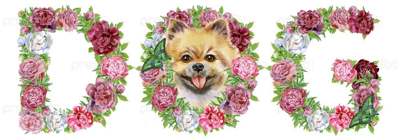 Word DOG с головой милой собаки из акварельных цветов
