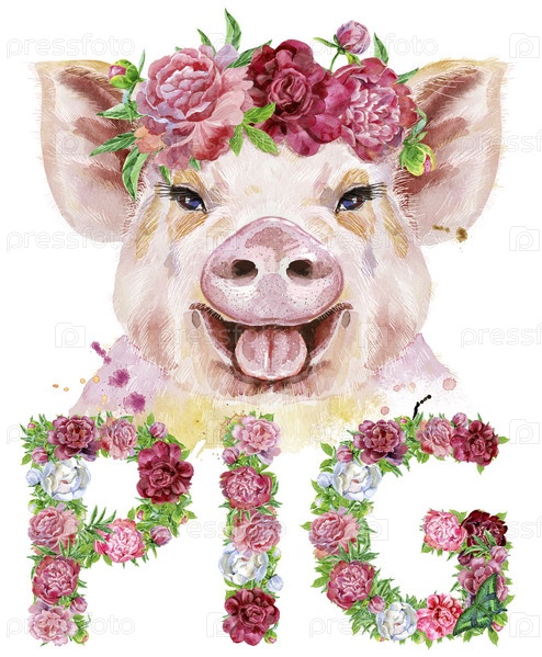 Водяной портрет свиньи со словом PIG из акварельных цветов