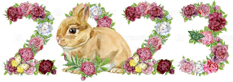 С Новым 2023 годом на фоне кролика, акварельных цветов и листьев