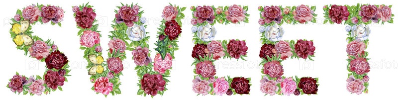 Слово SWEET из акварельных пион, цветов и бабочек