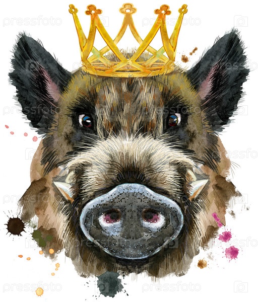 Милый поросенок с золотой короной. Кабан для графики на футболках. Акварельная иллюстрация коричневого кабана