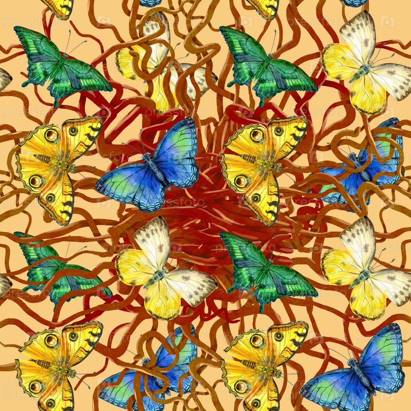 Цветочные листья бесшовный узор с красочными бабочками на желтом фоне. Художественный дизайн цветочной печати для упаковки, текстиля, обоев, подарочной упаковки, поздравления или свадебного фона
