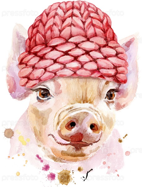 Милый поросенок в вязаной шапке. Свинья для графики на футболках. Акварельная розовая мини-свинья