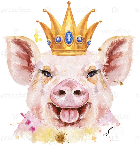 Милый поросенок. Свинья для графики на футболках. Акварель розовая свинья с короной