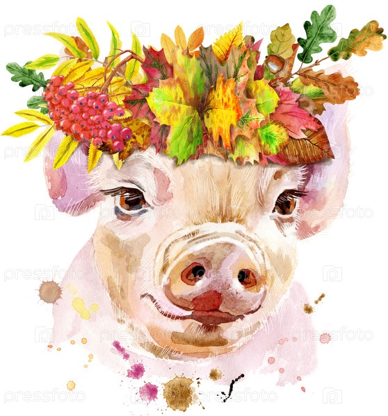 Милый поросенок с венком из листьев. Свинья для графики на футболках. Акварельная розовая мини-свинья