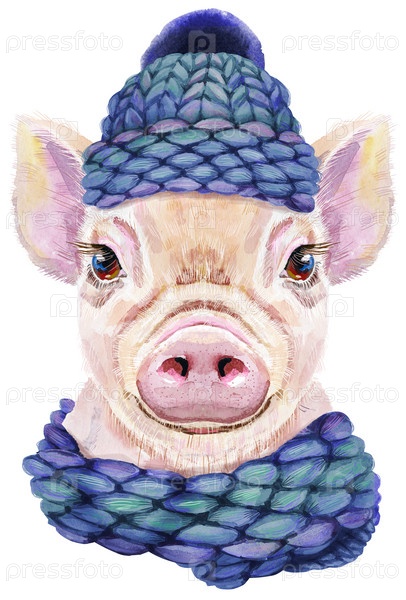 Акварельный портрет мини-свиньи в вязаной синей шапке и шарфе