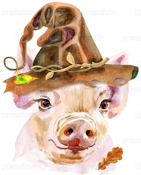Милый поросенок в шляпе на Хэллоуин. Свинья для графики на футболках. Акварельная розовая мини-свинья