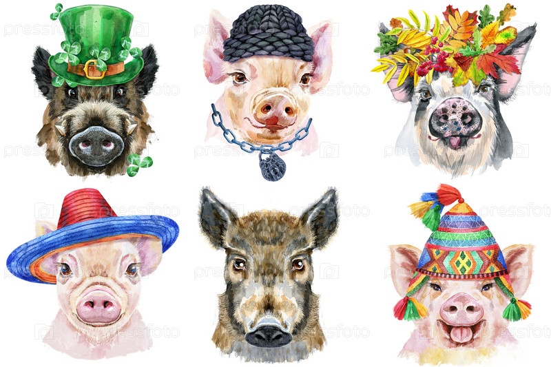 Набор портретов свиней. Акварельные иллюстрации животных на белом фоне