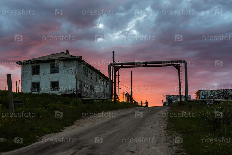 Страшный и ужасный закат. Разрушенный старый заброшенный каменный дом в селе Териберка Кольского района Мурманской области, Россия