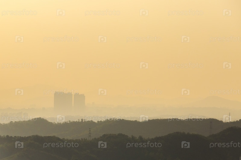 Смог в большом городе, загрязнение воздуха в городской среде. Концепция экологии