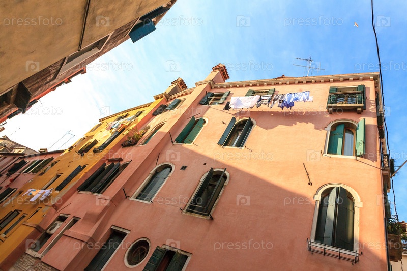 Старомодный традиционный фасад в Венеции, Италия. Сушка белья между окнами. Вид снизу