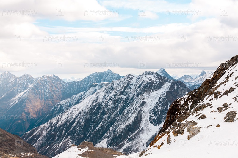 Высокий скалистый горный пейзаж. Красивый живописный вид на гору. Горнолыжный курорт Альп. Австрия, Штубай, Stubaier Gletscher