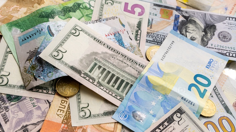 Фон из разных банкнот долларов, евро, рублей, белорусских рублей и другой валюты