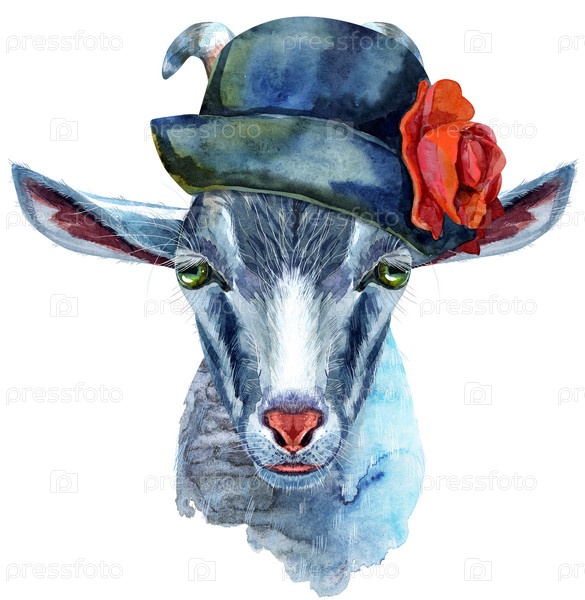 Коза в серой шляпе с акварельной иллюстрацией