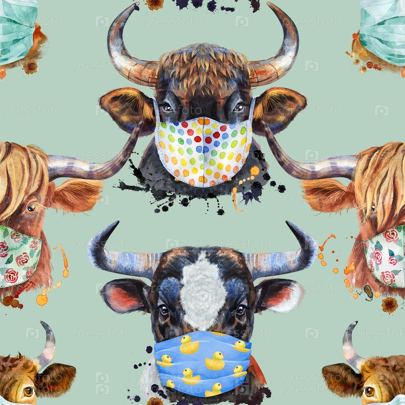 Акварельная графика быка. Бесшовный узор. Иллюстрация животного быка с всплеском акварельного текстурированного фона